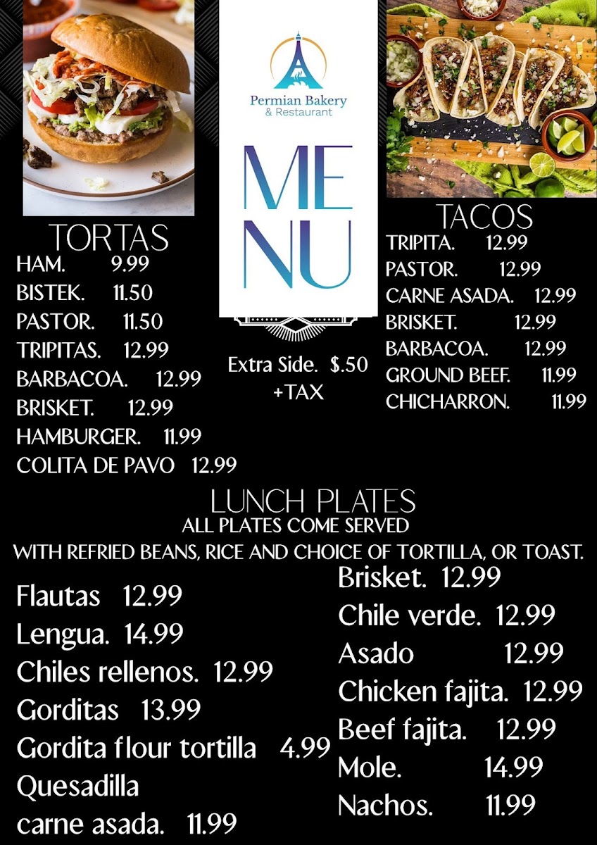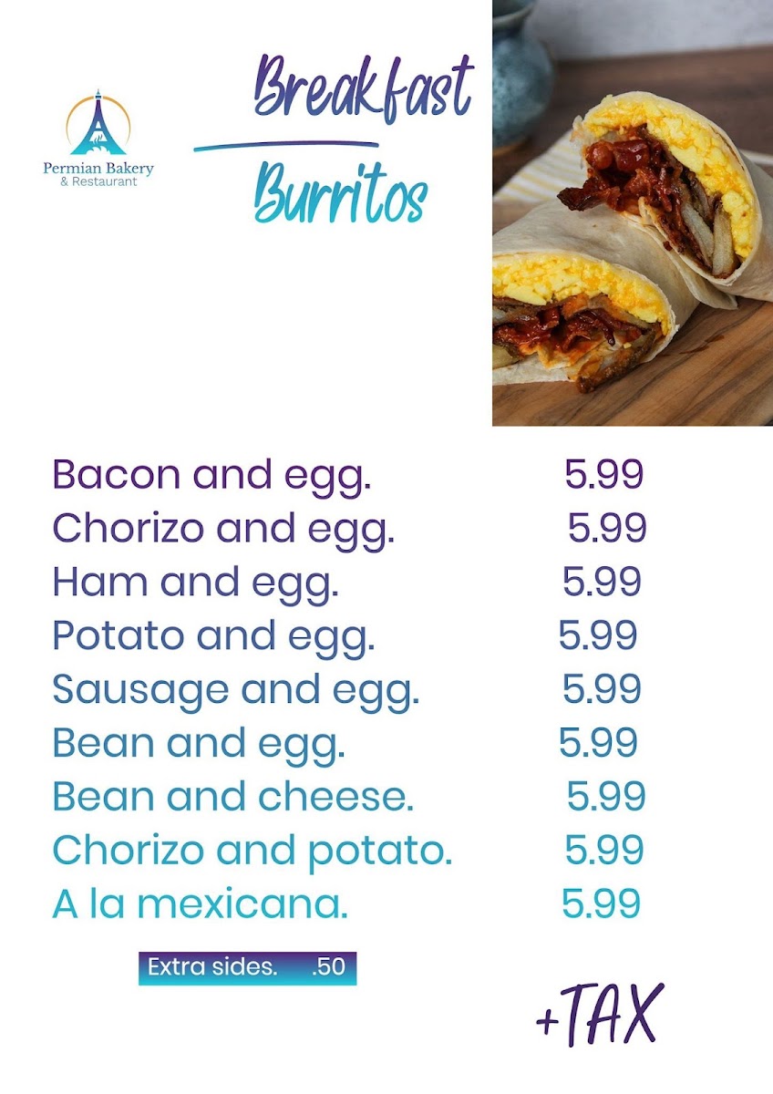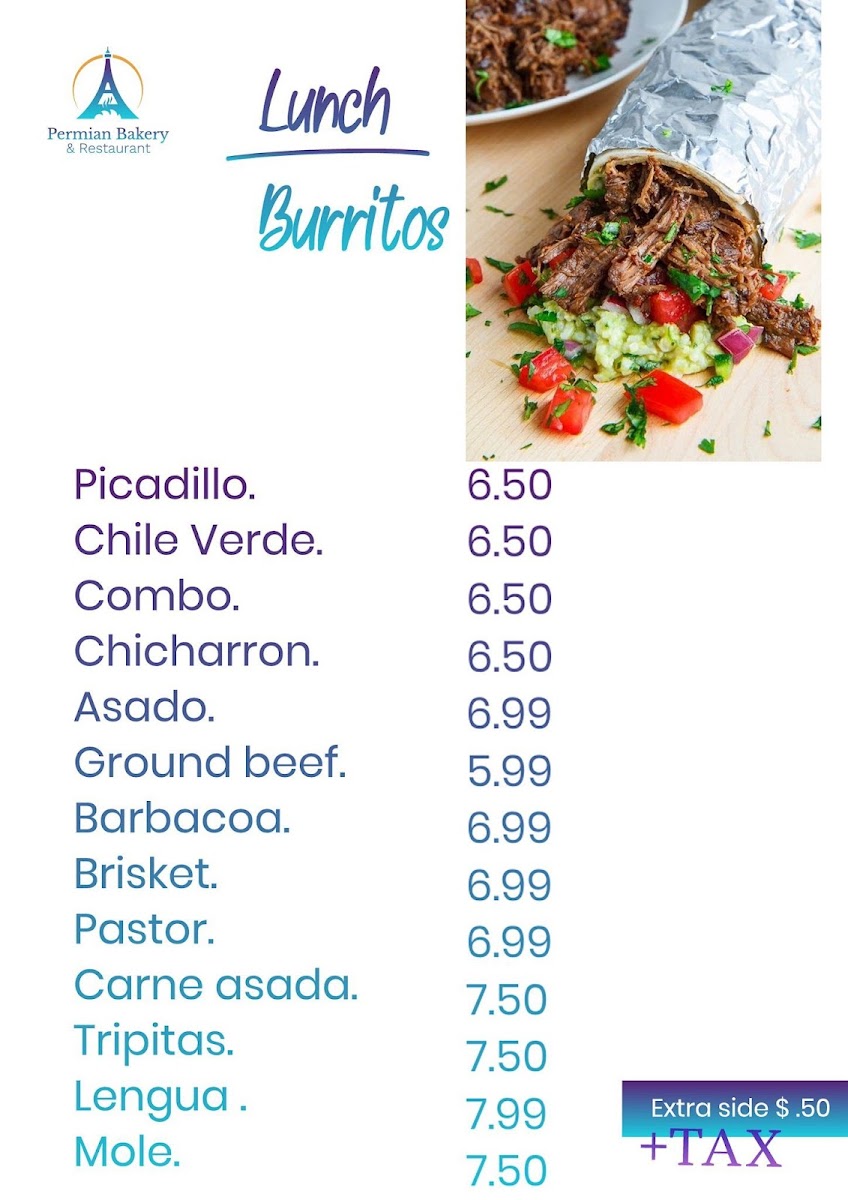 The menu at Permian Bakery & Restaurant offers a comforting selection that reflects hearty, homemade flavors. The Menu highlights classic morning favorites, including generous Breakfast Plates that arrive well-portioned and satisfying, ideal for starting the day with a balanced mix of eggs, meats, and sides. For something handheld and convenient, the Breakfast Burritos stand out-warm, filling, and packed with ingredients that make each bite rewarding. Later in the day, the Lunch Burritos continue this theme, offering a savory upgrade that keeps the same comforting appeal but with bolder flavors perfect for midday cravings. Adding a lighter option, the Chicken salad. provides a fresh contrast, served with tender chicken and crisp textures that balance the richer dishes. Overall, the menu combines homestyle simplicity with reliable flavor, making each selection feel familiar and well-crafted.